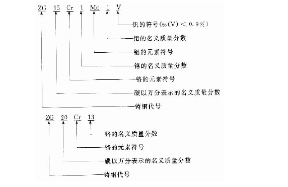 (3)鑄造合金鋼包括以化學成分為主要驗收依據(jù)的鑄造中、低合金鋼和高合金鋼,命名方法是在ZG后面用1組數(shù)字表示鑄鋼的名義萬分表示的碳的質(zhì)量分數(shù)。在碳的名義含量數(shù)字后面排列各主要合金元素符號,每個元素符號后面用整數(shù)標出其名義質(zhì)量分數(shù)。